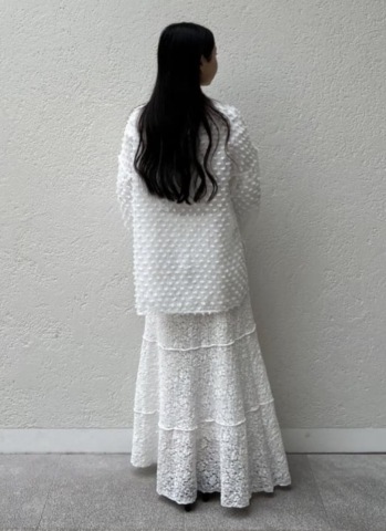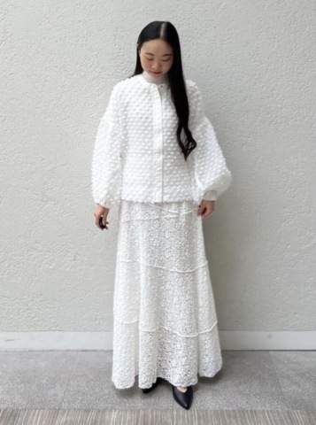 ぷっくりとした表面感のあるレース生地が特徴的なロングスカートです💐腰まわりはすっきりと裾に向かって自然に広がるシルエットで、甘くなりすぎず大人っぽく着用できます🌷🤍メロー調の切り替えラインのデザインがアクセントとなり、奥行きをプラスします🙆♀️✨ ぜひお試しくださいませ😊